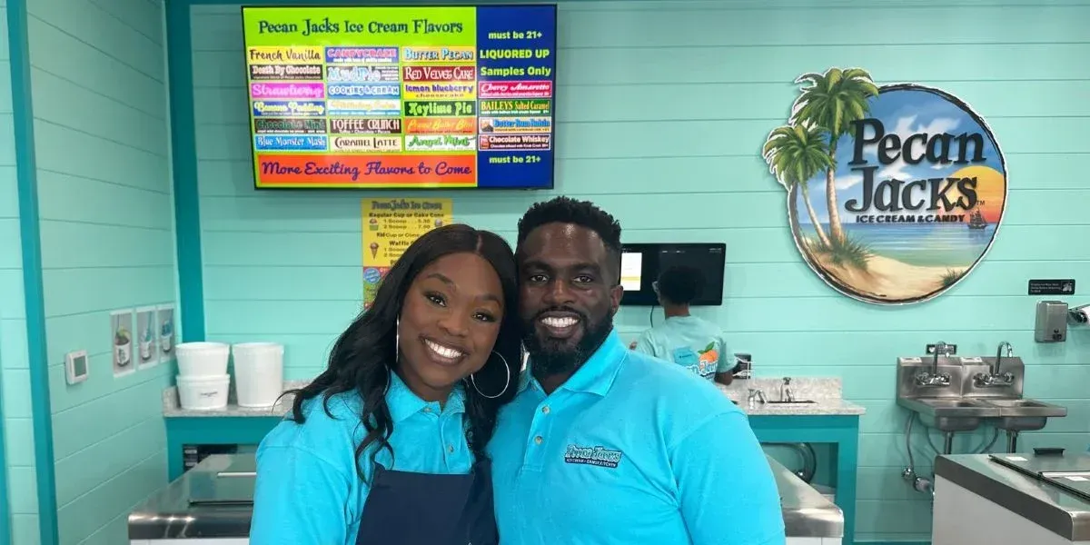 When franchisees Sherika and Mae Ekpo unlock the doors each morning to Pecan Jacks Ice Cream & Candy Kitchen in West Midtown, it’s not just another workday—it’s a chance to make someone’s day a little sweeter. Since opening their Atlanta shop just eight months ago, the husband-and-wife team has watched a steady stream of customers discover (and quickly develop an appreciation for) the vibrant, beach-born brand that has become a Georgia favorite over time.
